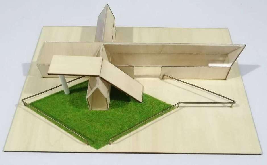 Concept: This model is made of wood and acrylic board,plastic,iron wire,plastic grass .I used those materials to transfer to this model but I'm also trying to turn this into an actual functional building. For example I translate the black rectangle to a wood balcony and red thin line to a rail.