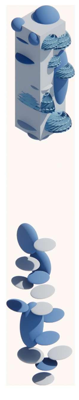 Concept: My concept grew from the trash that I see everyday. Garbage and trash can be an important factor in representing a place. So I started collecting garbage from the place where I lived everyday. I took photos of each item and then drew those. Then I attempted to organise the garabage into similarly shaped I started with a basic cuboid form for each structure to harmonize the buildings and then added the refined shapes from my garbage studies. I named each building separately with a different code on the right: