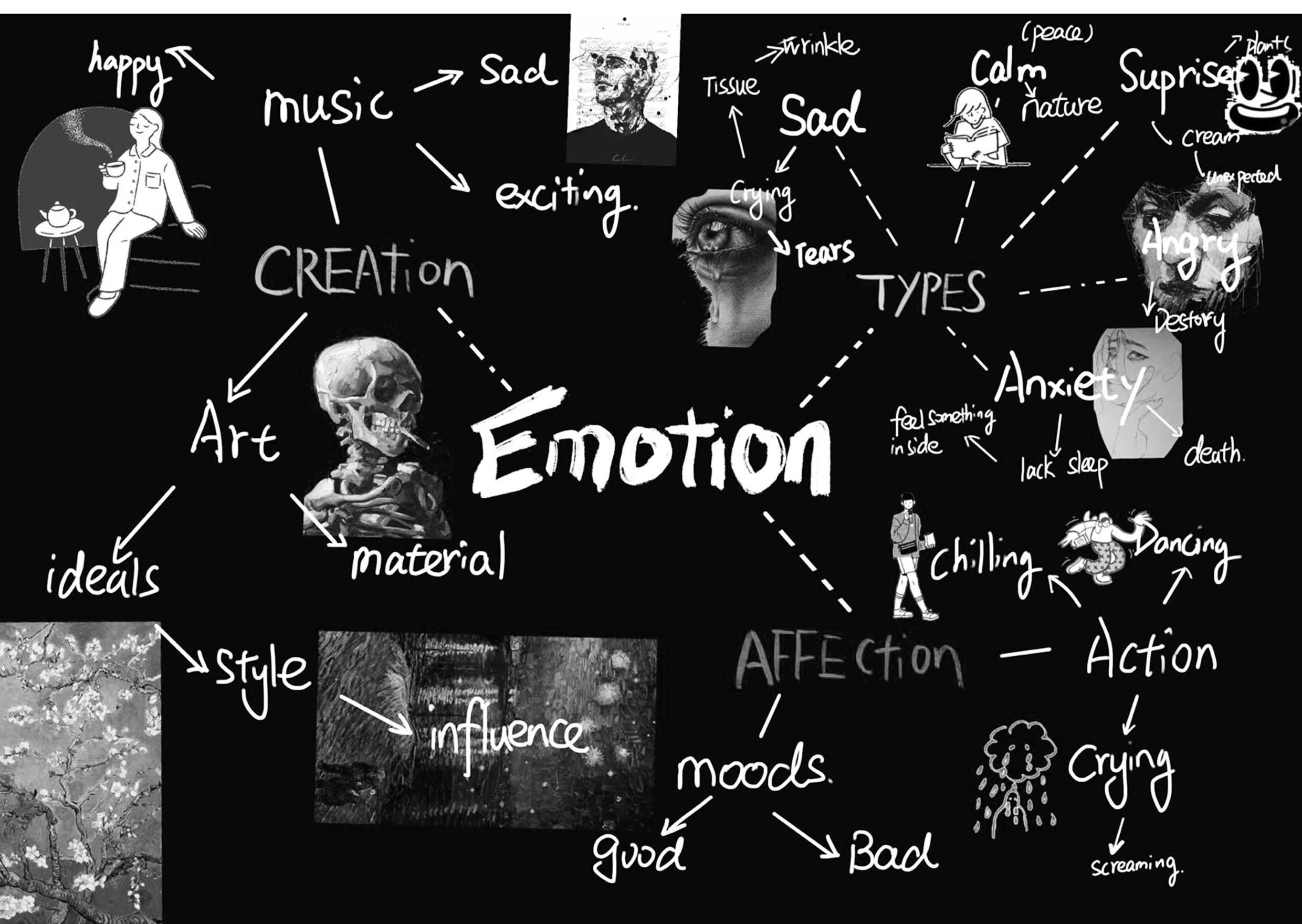 I creative a mind map before I started the Art installation. I list what different types of emotions, what's those emotions could bring to us and what affection those feelings could impact us. Then I start using small cude to describe those feelings.