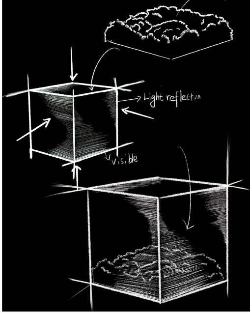 The feeling of peace always relate me about the peace of nature so I put mosses into the cube and put some water to make mosses fresh.