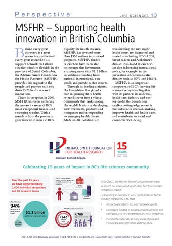 ehind every great discovery is a great researcher, and behind every great researcher is a support network that allows creative minds to flourish. In the province of British Columbia, the Michael Smith Foundation for Health Research (MSFHR) provides this support to the people and projects that help drive BC’s health research innovation. Since its inception in 2001, MSFHR has been nurturing the research careers of BC’s most exceptional trainees and emerging scholars. With a mandate from the provincial government to increase BC’s