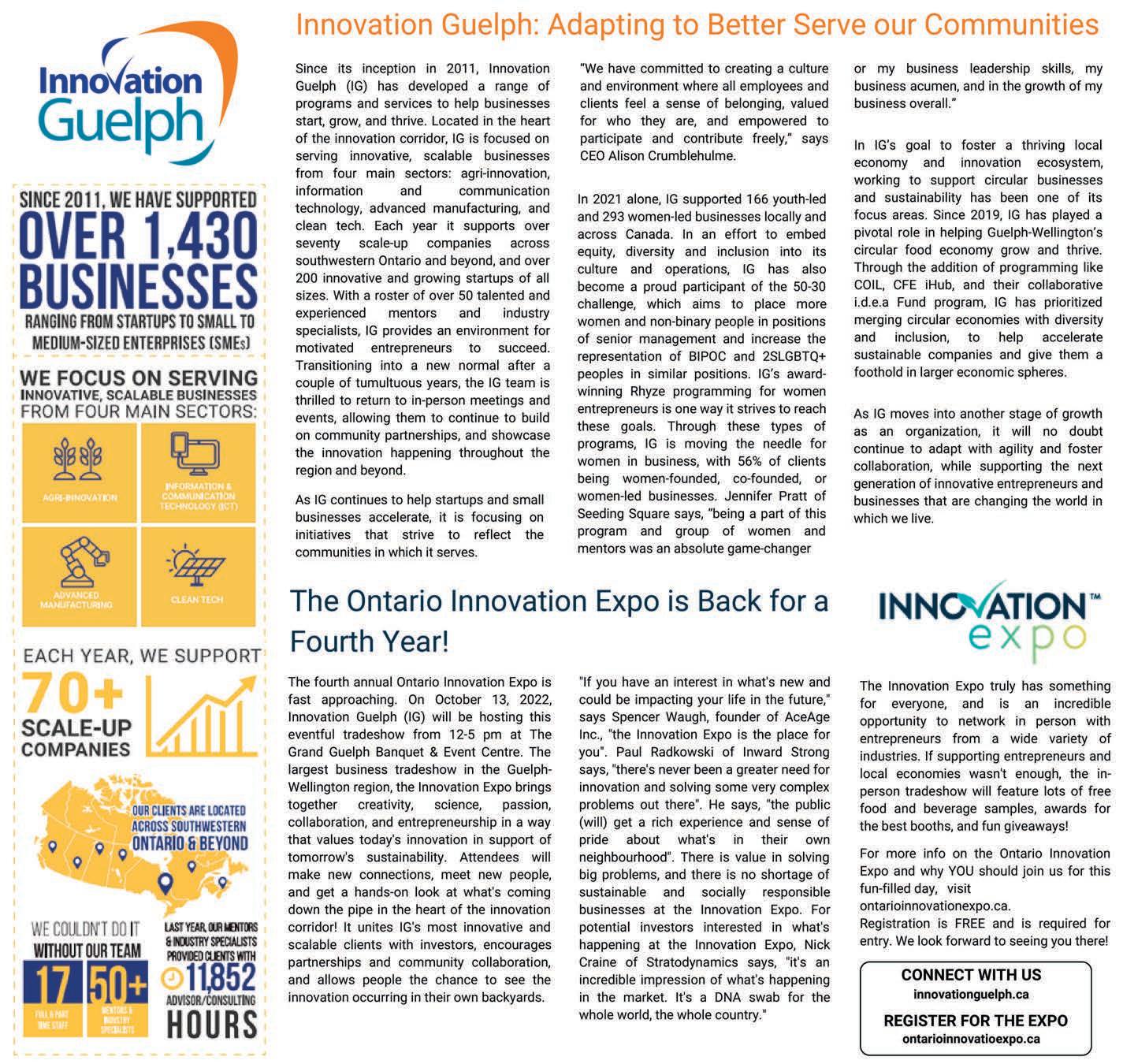 invitation to present at the 2022 United Nations Climate Change Conference (COP27) later this fall. Cities across Canada and around the world are taking inspiration from their work, watching to learn how they can replicate Guelph-Wellington’s innovative, environmentally-minded and successful business ecosystem.