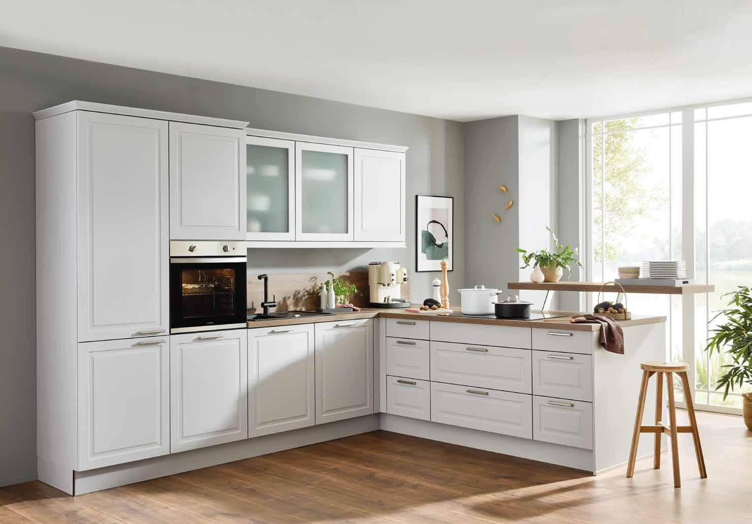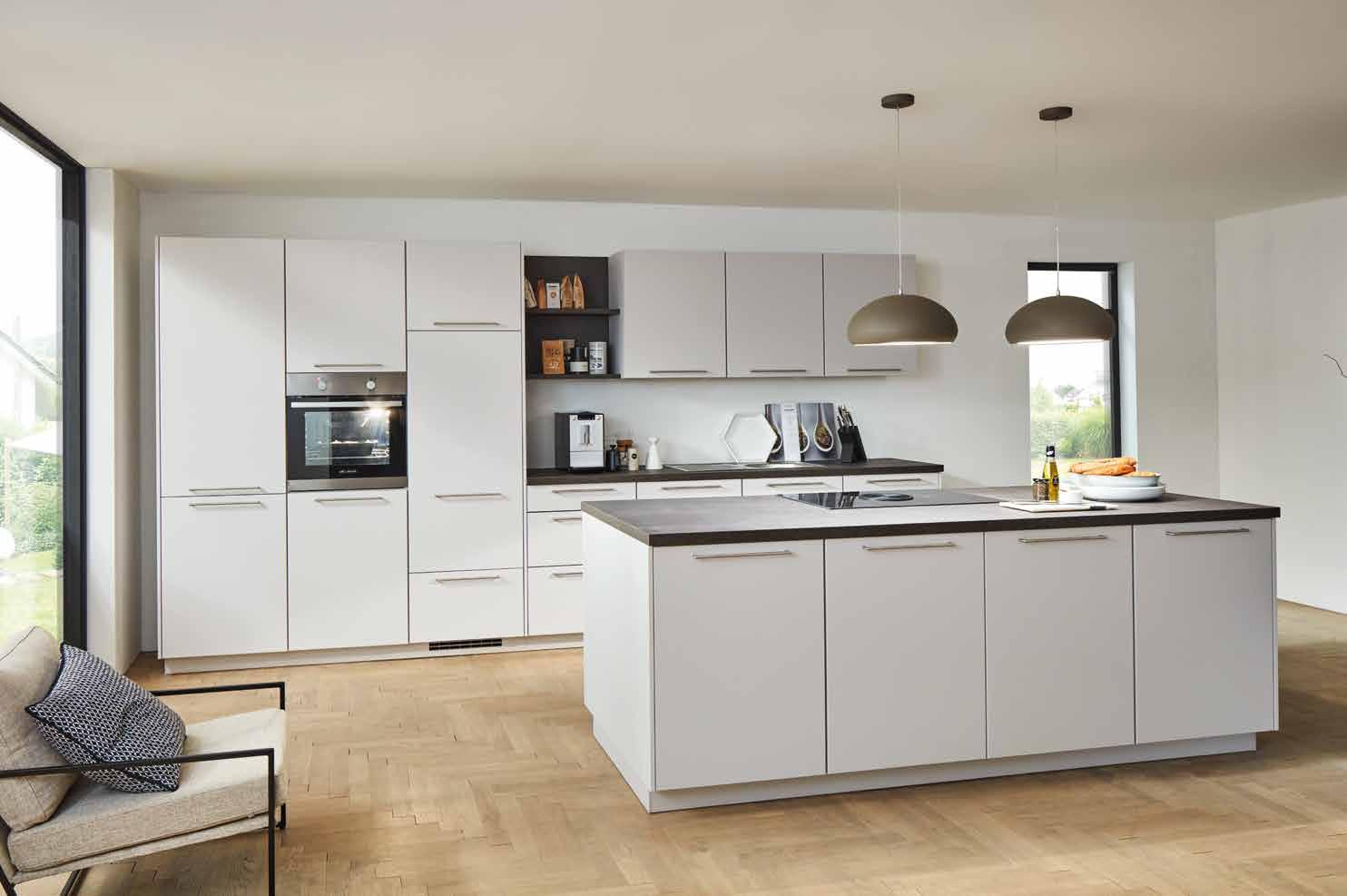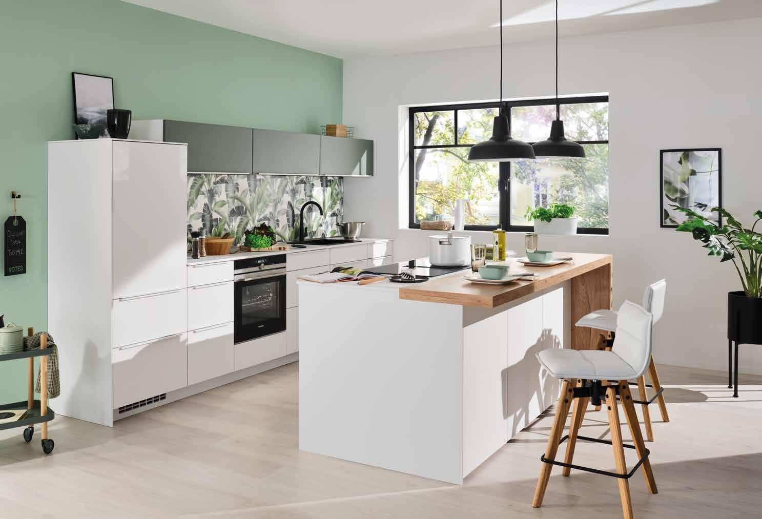 setzt auf ausdrucksstarke Küchenfronten in maximal zwei Farbtönen, die durch die gelungene Mischung aus geschlossenen und offenen Elementen sowie verschie denen Höhen in Szene gesetzt werden. So kommen die wenigen ausgesuchten Accessoires, die der Küche eine persön liche Note geben, auch noch besser zur Geltung. Unverzichtbar für ein anspre chendes Ambiente, das zum entspannten Small Talk bei einem Espresso oder einer Tasse Tee vor der Küchenzeile einlädt.
