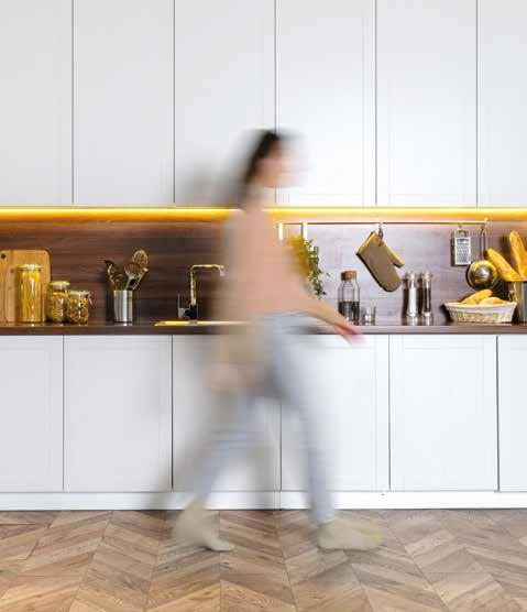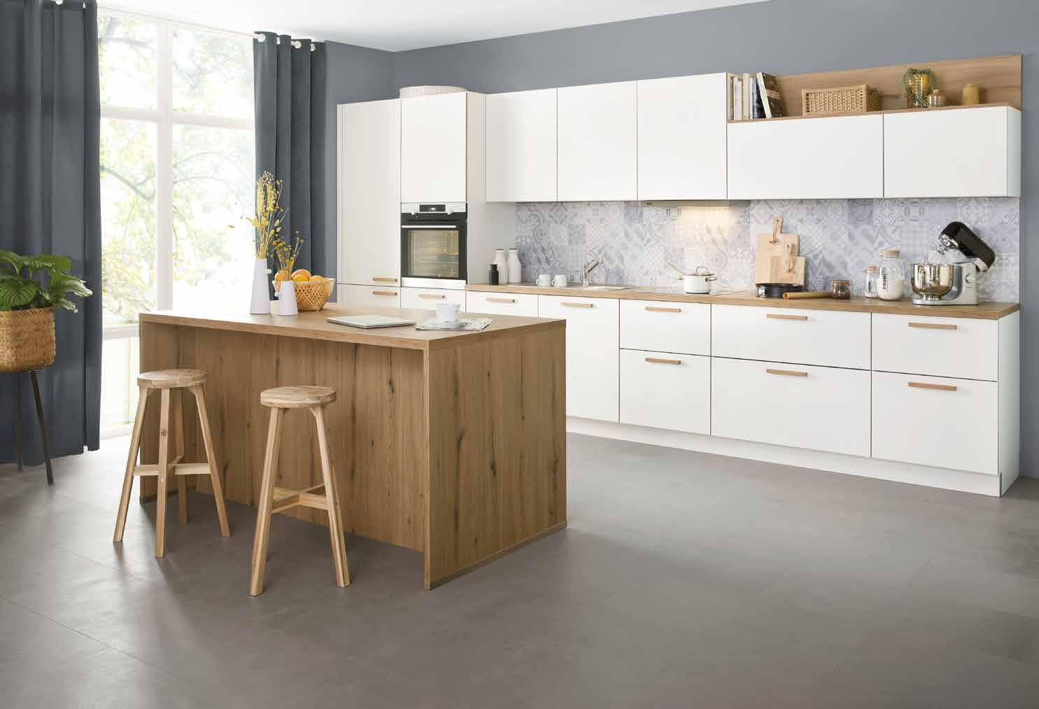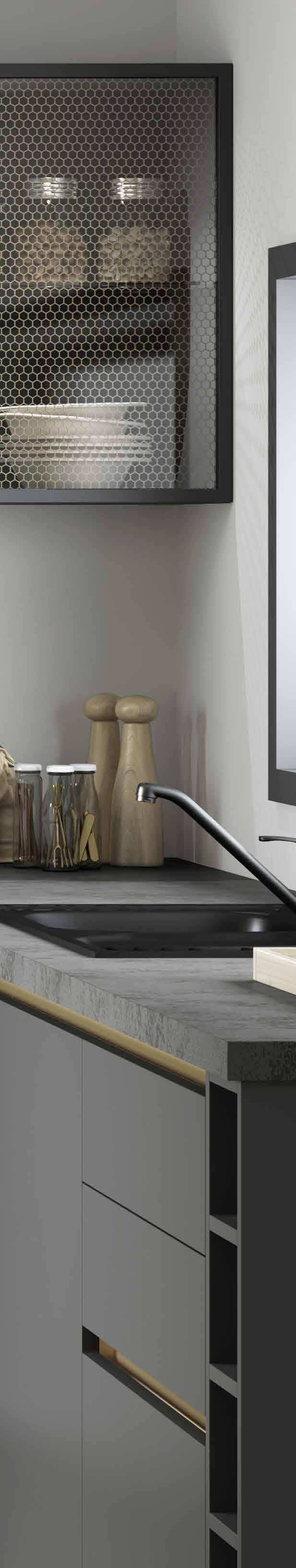 setzt auf ausdrucksstarke Küchenfronten in maximal zwei Farbtönen, die durch die gelungene Mischung aus geschlossenen und offenen Elementen sowie verschie denen Höhen in Szene gesetzt werden. So kommen die wenigen ausgesuchten Accessoires, die der Küche eine persön liche Note geben, auch noch besser zur Geltung. Unverzichtbar für ein anspre chendes Ambiente, das zum entspannten Small Talk bei einem Espresso oder einer Tasse Tee vor der Küchenzeile einlädt.