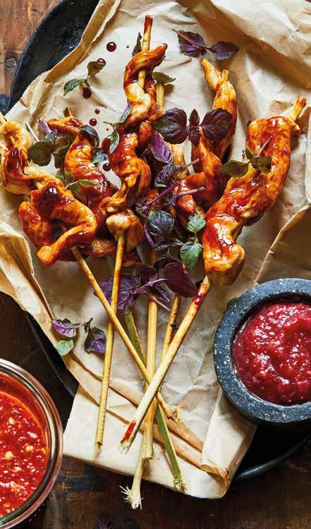 und fein hacken. Schalotten, Knoblauch und Chili in einem Topf im Öl anschwitzen. Pflaumenpüree, 2 TL Honig und Essig dazugeben und alles etwa 5 Minuten unter Rühren einkochen lassen. Mit Salz und Pfeffer würzen, dann abkühlen lassen. Das Fleisch waschen, trocken tupfen und längs in dünne Streifen schneiden. Wellenförmig auf Spieße stecken, salzen, pfeffern und rundum mit Sesamöl bestreichen. Eine Grillpfanne ohne Fett erhitzen und die Spieße darin von jeder Seite etwa 2 Minuten braten. Dann die Sojasauce und den übrigen Honig (1 ½ EL) darüber träufeln und alles dickflüssig einkochen lassen. Die Satés mit Pflaumensauce und Micro Leaves anrichten.