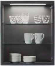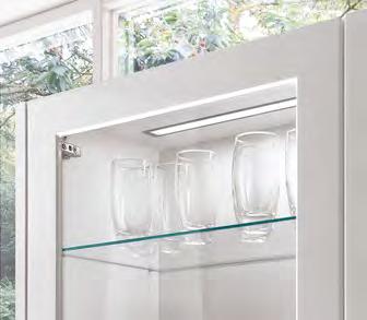 The modern glass wall unit Climber with its slatted glass front gives the kitchen a whole new dimension and is transformed into an absolute eye-catcher thanks to targeted lighting effects. Available in mechanical or electronic versions.