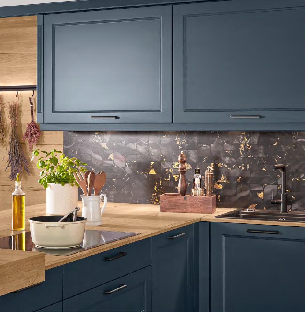 A subtle design language helps exclusive details to achieve an even better effect. This design features an interplay of matt blue fronts, a niche and a worktop made of quartz stone and gold-coloured design elements. It adds a special touch to everyday life.