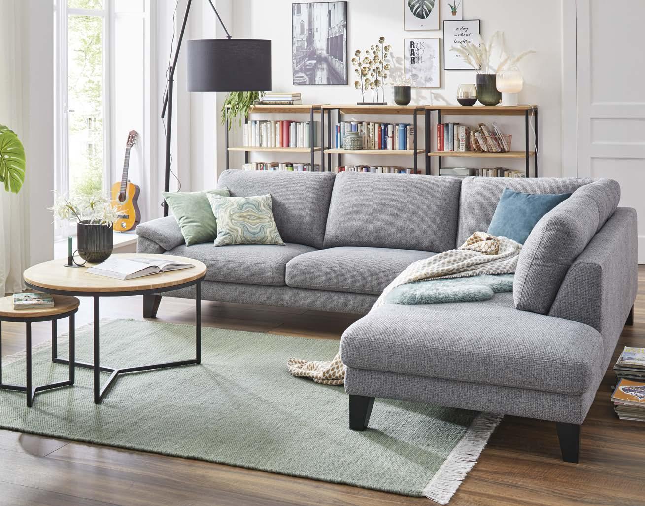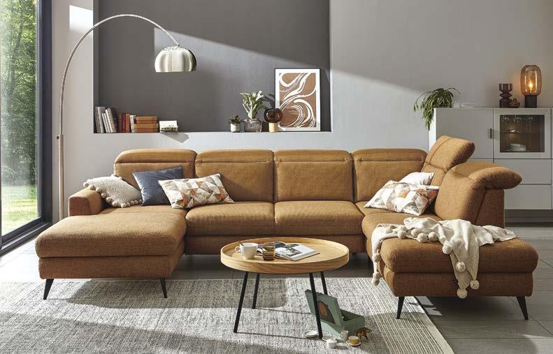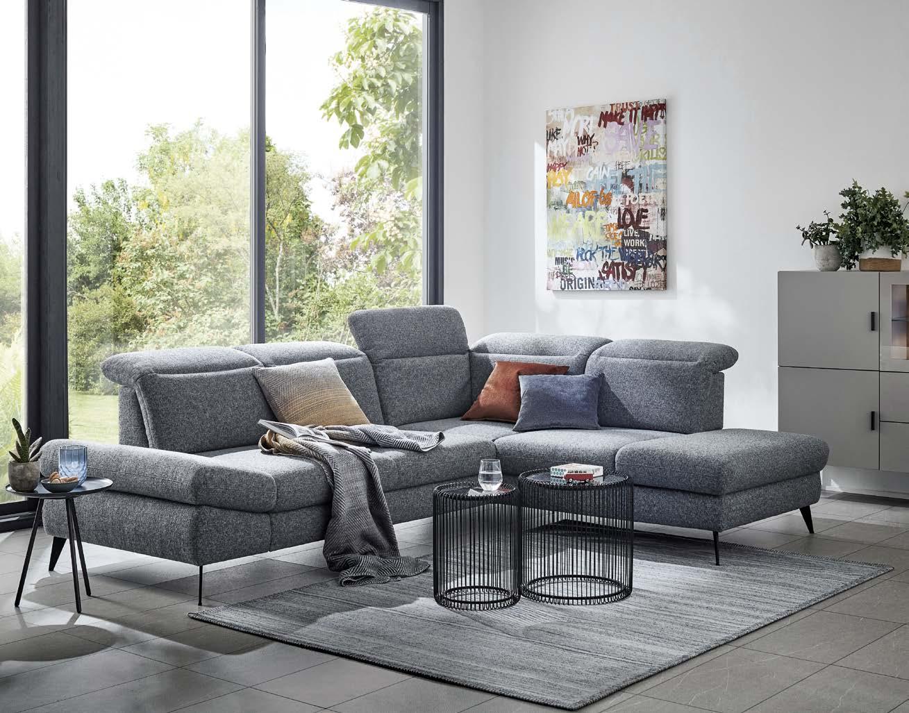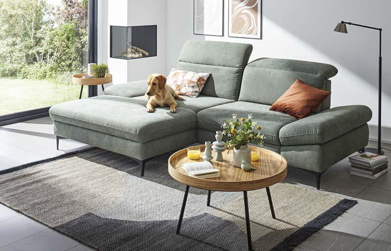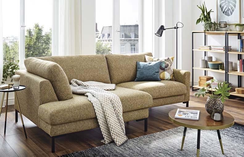 Aus dem Polsterprogramm Global Alegria: 1 Polsterecke in Stoff Cats niagara, 85% Polyester, 15% Nylon, Armlehne A klappbar, Sitzpolsterung Kaltschaum, Füße Metall schwarz, inkl. verstellbarer Kopfteile, bestehend aus: Longchair groß mit Armlehne links, 1,75-Sitzer mit Armlehne rechts und Sitztiefenverstellung, BHT ca. 262x88x190 cm, 2398.-*, 2 Wohnlandschaft in Stoff Catona gold, 100% Polyester, Armteil B, Sitzpolsterung Kaltschaum, Füße Metall schwarz, inkl. Kopfteilverstellung, bestehend aus: Longchair mit Armlehne links, 2,5-Sitzer inkl. Sitztiefenverstellung, Eckelement mit 1-Sitzer und Abschlussteil rechts, Stellmaß ca. 333x88x241 cm, 3698.-*. Gegen Mehrpreis: Stauraum im Longchair und Schlaffunktion im 2,5-Sitzer, 3 Couchtisch, MDF/Eichenfurnier/Stahl, ØH ca. 78x45 cm, Tablett abnehmbar, 4 Beistelltisch, MDF/Eichenfurnier/Stahl, ØH ca. 46x55 cm, Tablett abnehmbar