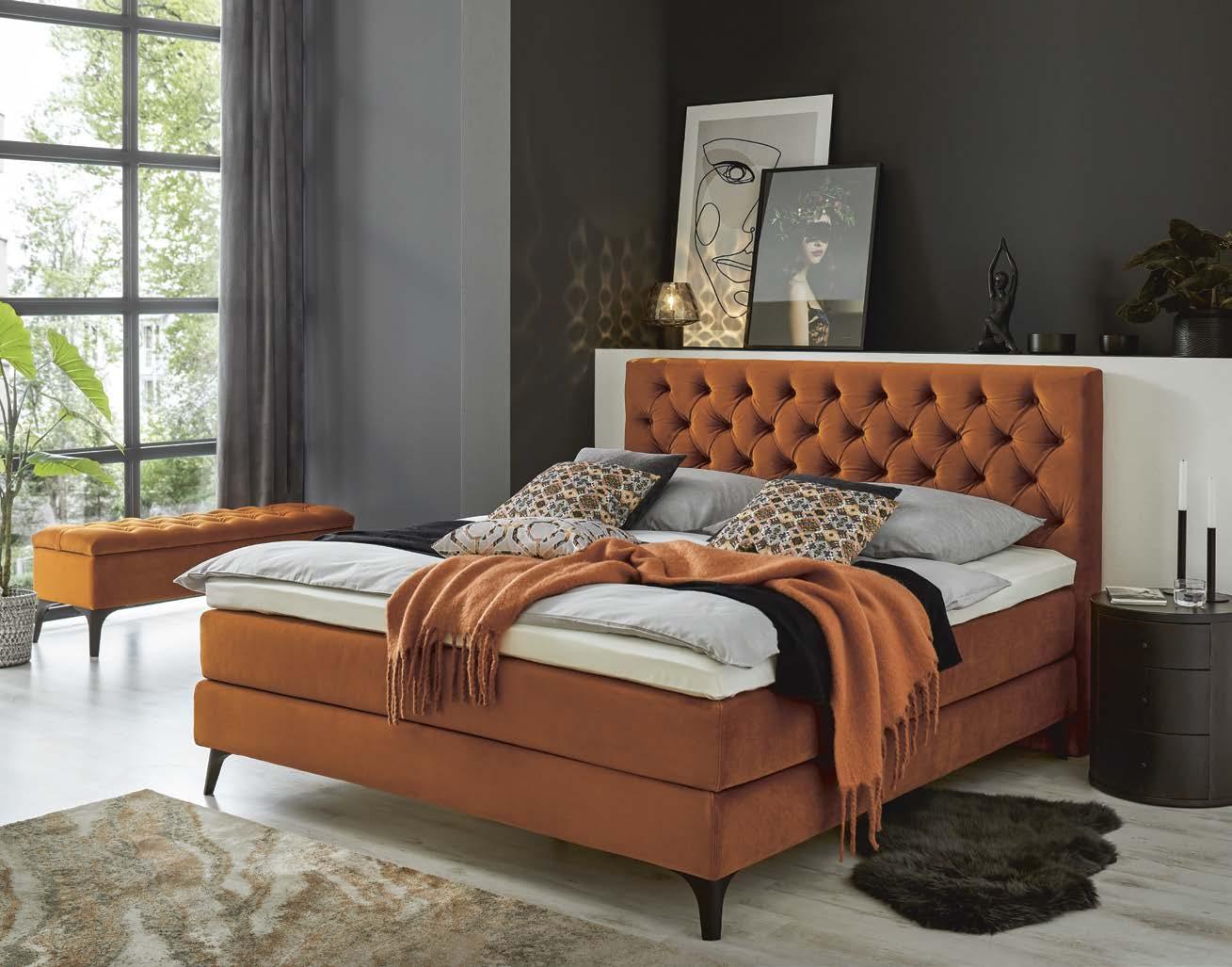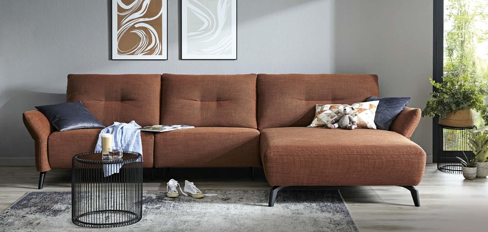 Aus dem Polsterprogramm Global Bahia: 1 Polsterecke in Stoff kupfer, 100% Polyester, Füße Metall schwarz, Armlehnen klappbar, bestehend aus: 2,5-Sitzer mit Armlehne links, XL-Longchair mit Armlehne rechts, BHT ca. 302x88x166 cm, 2098.-