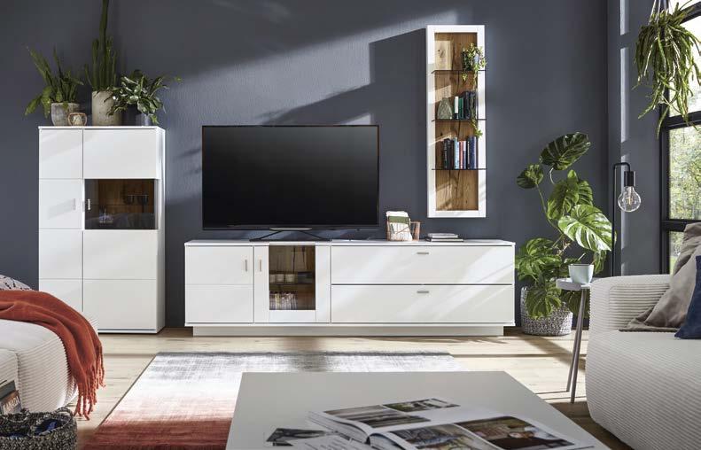 Aus dem Wohnprogramm Global Rubia, Front außen: Lack weiß, Korpus innen: Melamin weiß, Front- und Seitenverglasung: Parsol grau, sichtbare Rückwand: Riss-Eiche furniert, Metallgriffe: Nickel matt, Schubkästen und Türen gedämpft: 1 Wohnwand bestehend aus: Highboard mit 1 Holztür, 1 Holz-/Glastür, Lowboard mit 1 Holztür, 1 Tür mit Glaseinsatz, 2 Schubkästen, Wandpaneel mit 3 Glasböden, Stellmaß BHT ca. 305x207x50 cm, 1998.-*, 2 Highboard mit 1 Holztür, 1 Holz- / Glastür, 3 Schubkästen, BHT ca. 160x112x38 cm, 1149.-*, 3 Sideboard mit 1 Holztür, 1 Holz-/Glastür, 3 Schubkästen, BHT ca. 180x87x44 cm, 4 Couchtisch, Oberfläche und Bodenplatte Lack weiß, mit Glasablage, BHT ca. 115x46x65