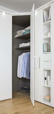 Global Libro 100 Abgerundete AbschlussschränkeVerschiedene Beleuchtungsoptionen Offenes Regalelement mit Schubkästen Begeh barer Eck schrank 7 verschie dene Standard breiten sowie Maßanfertigun gen stehen zur Auswahl 3 Standardhöhen: ca. 197, 223 und 240 cm Schubkästen in verschiedenen Breiten 2 Standardtiefen: ca. 44 und 62 cm Wahlweise in verschie denen Dekoren erhältlich Zimmerecken perfekt genutzt mit begehbaren Eckschränken!