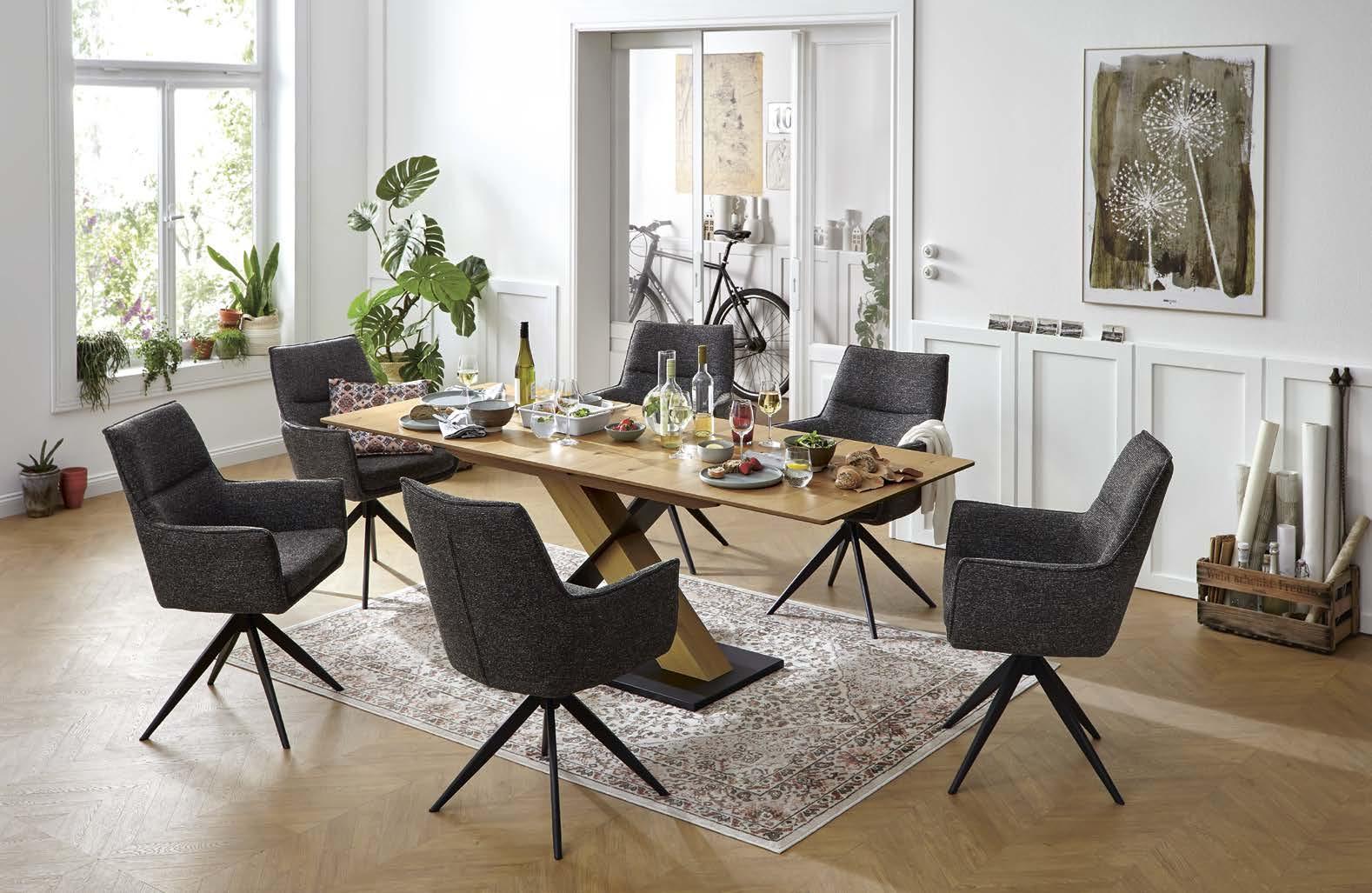 Und Trinken auch. Global dinner macht eben alles mit: Vom geselligen Brunch über Spieleabende bis zum schönen Dinner. Essen ist fertig: Global dinner. ↘ Aus dem Speisezimmerprogramm Global dinner: 1 Esstisch 6663 mit Synchronauszug, Tischplatte Charakter-Eiche furniert, Gestell Charakter-Eiche furniert / Metall schwarz, Verlängerungsplatte ca. 40 cm, BHT ca. 180(220)x76x90 cm, 1698.-*, 2 Komfort-Schalensessel 4052 mit Design Einzug im Rücken, Stoff Sneak anthrazit, 100% Polyester, Gestell Stativ Eisen schwarz, BHT ca. 61x92x67 cm, 329.-*. Gegen Mehrpreis: 360 Grad drehbar mit automatischer Rückholfunktion Global dinner Global dinner Stuhl 329.-* 2 Global dinner Esstisch inkl. Ausziehfunktion 1698.-* 1 ** Deine 5-Jahres-Möbelgarantie (EMV-Möbelgarantie) erhältst Du durch eine 3-jährige Anschluss-Garantie, die lückenlos an Deine gesetzliche 2-jährige Gewährleistung anschließt. Art und Umfang dieser Garantie gemäß Garantiebedingungen unter www.global-moebel.de/Garantie. *Alle Preise sind Abholpreise in € inkl. MwSt.; ohne Lieferung und Montage; ohne Deko. Preise und Produkte sind gültig bis 31.01.2023. Die aktuellen Preise findest Du unter www.global-moebel.de auf der jeweiligen Modellseite oder durch Scannen des Codes.20 221070-020-A4C 221070-021-A4C 21