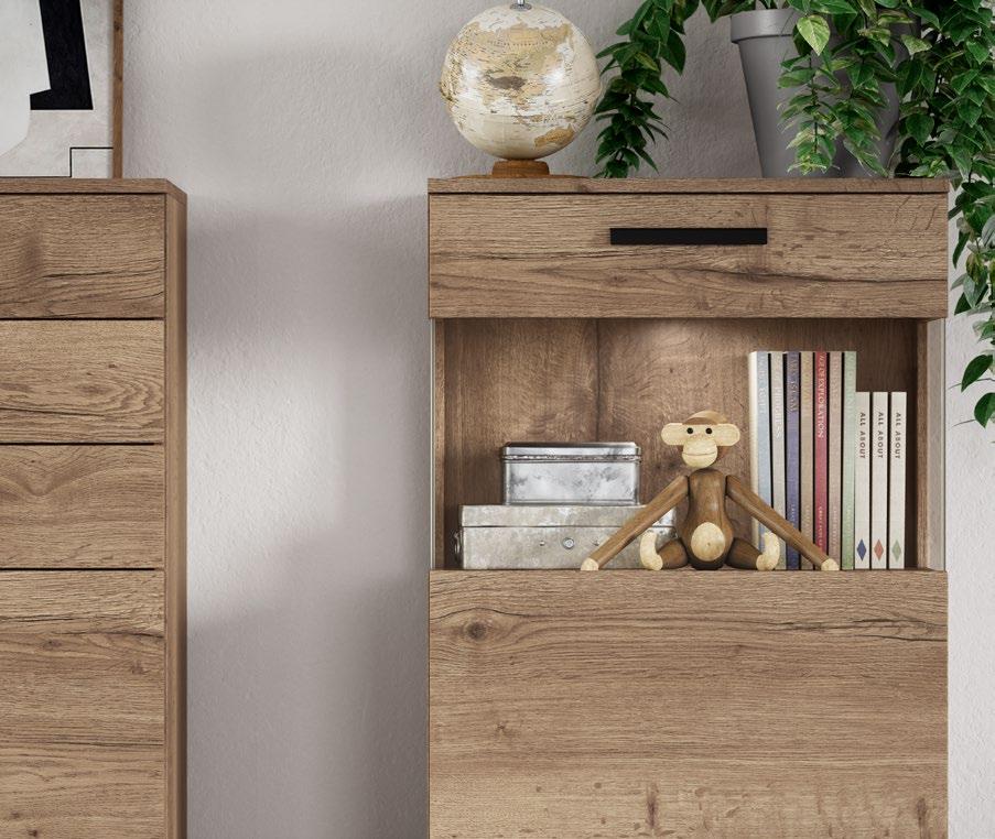 The niche cladding in a wood appearance sets the stage for this particularly elegant design. Design highlights: the fronts in warm colours with optical depth effect.