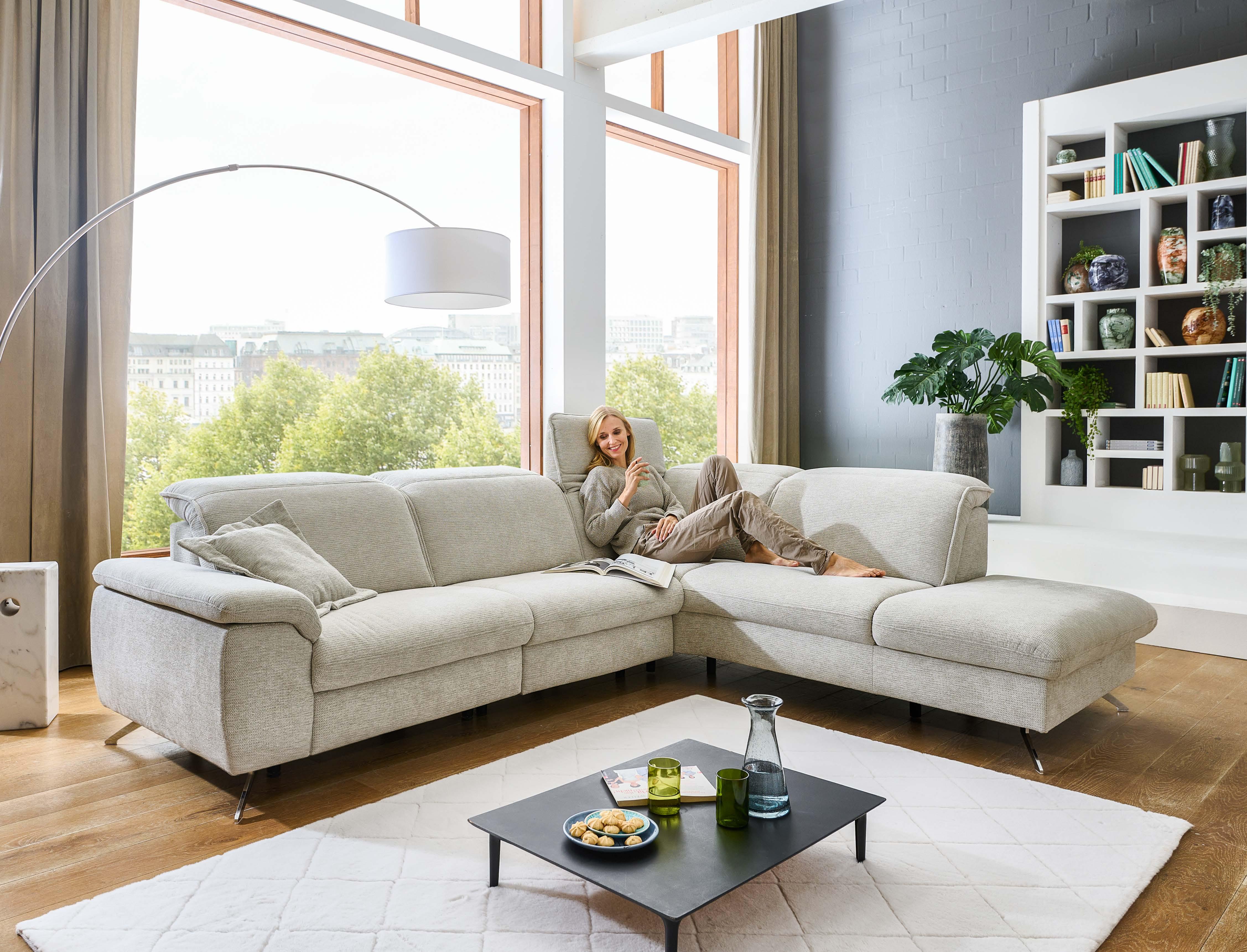 Couchecke LS23 Bars Canapé mit Armteil links, 2,5-Sitzer inkl. manueller Sitztiefenverstellung, Spitzecke und 1,5-Sitzer manueller Sitztiefenverstellung und Anstellhocker rechts, Stoff Mikrofaser Holiday PG2 Eisengrau, (100% Polyester), inkl. Kappnaht mit Kontrastfaden beige, Füße alufarben, Rücken in Möbelstoff bezogen, B/H/T ca. 356×89×254 cm, Sitztiefe ca. 56 cm / verstellt 76 cm, Sitzhöhe ca. 47 cm, 2798.-