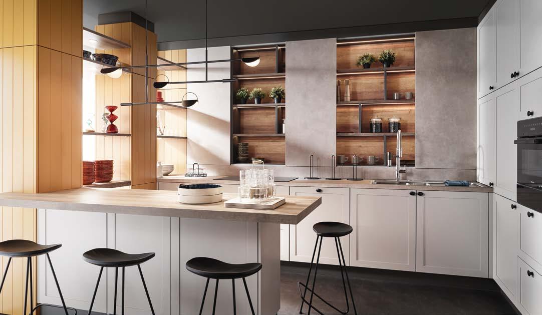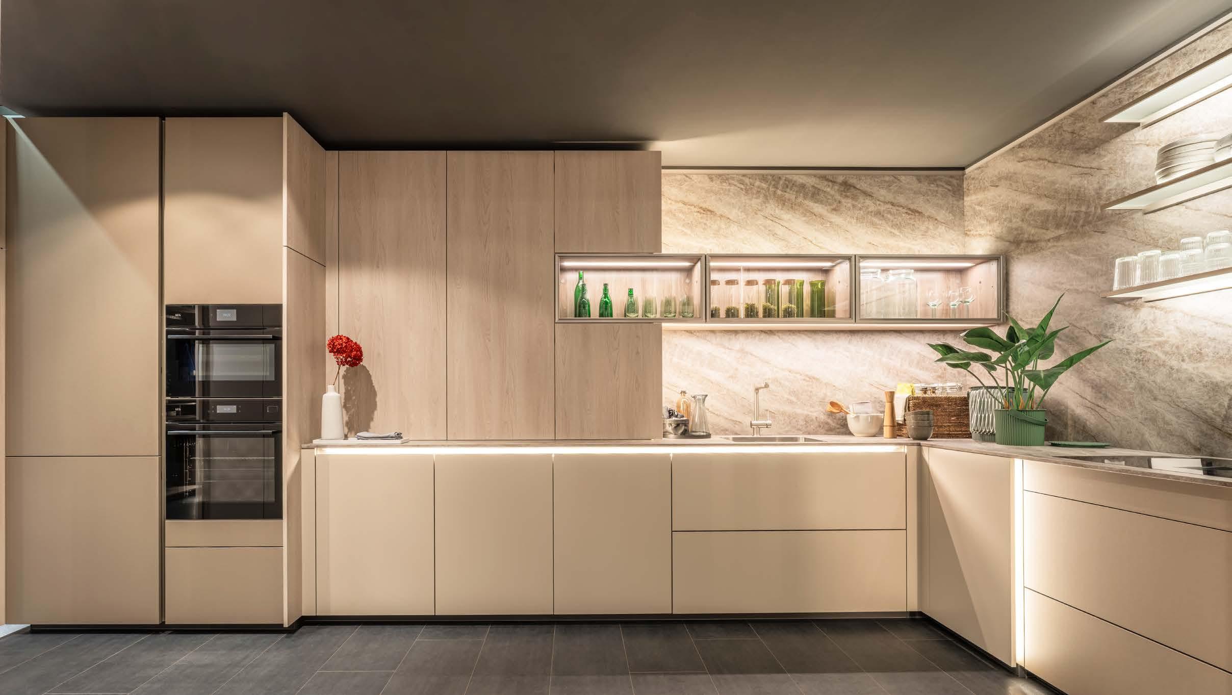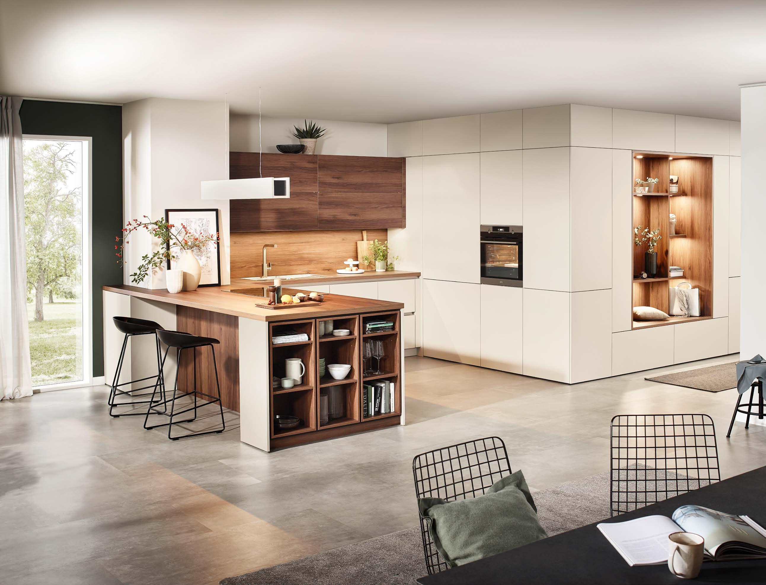 Einbauküche, Front Feinstein sand/Casella Eiche, Faceline, Regalwandspot CONNECT.