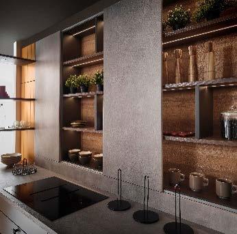 Mit cleverern Stauraumlösungen auf der Inselrückseite versteckt eine Schiebetür mittels unsichbarer Schranköffnung die Küchenutensilien. Einfach antippen und öffnen!