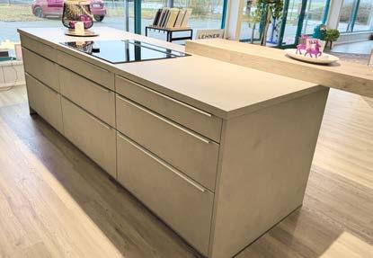 Einbauküche, mit Insel und Barplatte, Front Beton kieselgrau NB., Absetzung Wildeiche natur NB, ca. 340 cm lang, Insel ca. 280/100 cm, Barplatte ca. 150/40 cm, ohne Geräte, ohne Spüle, ohne Deko.
