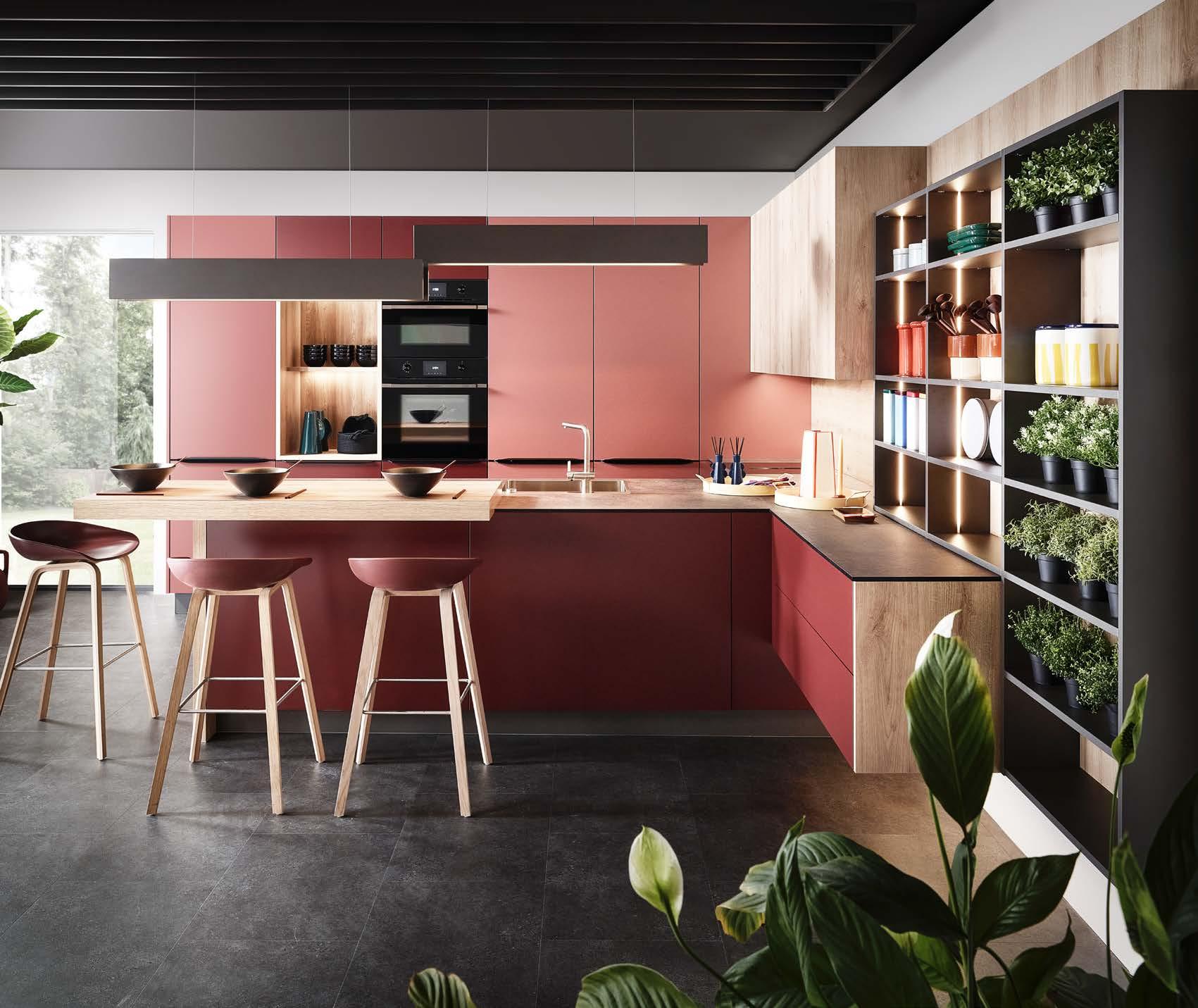 Einbauküche, Front Fabiola Rüster zimt/Leona Schwarzkies, Floralstruktur/Walnuss/Selma schiefer, Korpus metallschwarz, Arbeitsplatte DEKTON Laurent - Softline Konzept