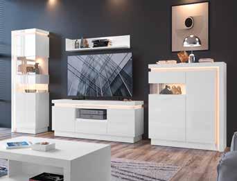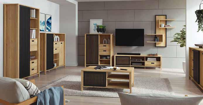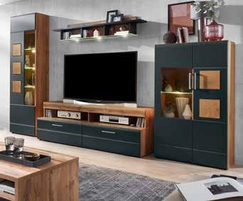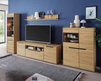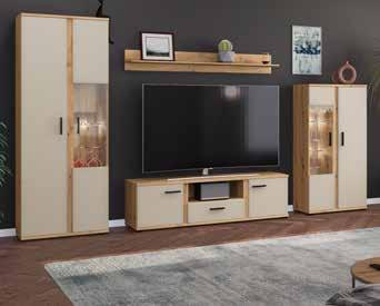 Trendige Wohnwand in Artisan Eiche Nachbildung, kombiniert mit Absetzungen in Kaschmir, mit ausreichend Stauraum.