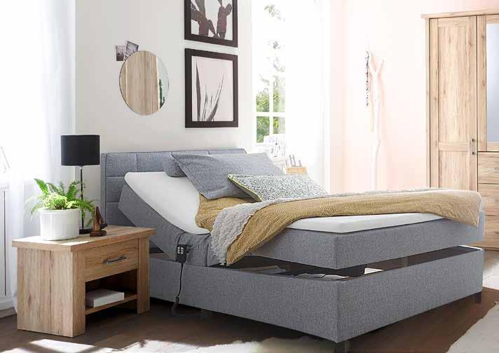 Praktisch und komfortabel zugleich. Dieses Schlafzimmer in Kombination aus den Schränken in San Remo Eiche Nachbildung und dem grauen Motor-Boxspringbett lädt zum Entspannen ein.