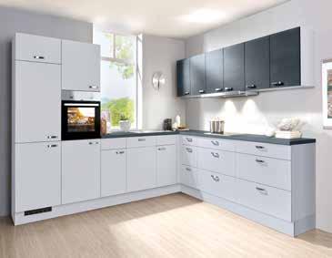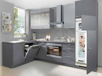 Großzügige Winkelküche Win/Base, Front Hellgrau matt/ Hängeschränke Stahl dunkel Dekor, inkl. Beko Elektrogeräten und Edelstahlspüle, ca. 335x290 cm. Geräte Abbildung ähnlich.