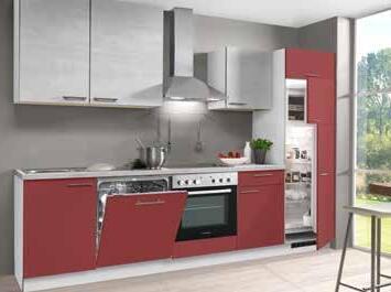 Win, karminrot Dekor matt, Hängeschränke abgesetzt in Betonoptik hell, inkl. PKM Elektrogeräten und Edelstahlspüle, ca. 280 cm. Geräte Abbildung ähnlich.