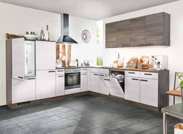Winkelküche Plan, Front Eiche Weiß Dekor, Hängeschränke und Korpus Eiche Grau Dekor, inkl. Beko und PKM Elektrogeräten und Edelstahlspüle, ca. 315x305 cm. Geräte Abbildung ähnlich.