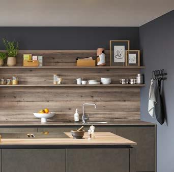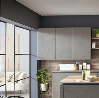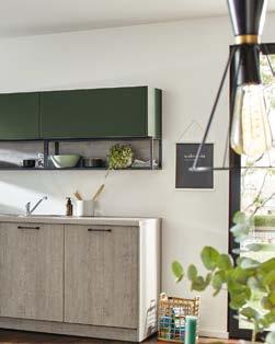 Industrie-Schick mit Beton Nebelgrau Nachbildung meets Waldgrün samtmatt Lack. Die City bringt die Gegensätze zusammen. Über Eck geplant steckt jede Menge Stauraum für Dich drin.