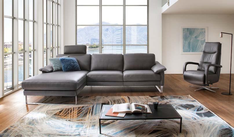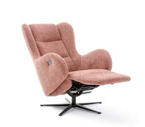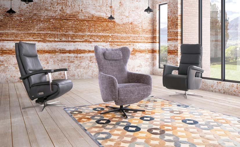 Relaxsessel BEPPO in Leder; elektrische Fußteil- und Rückenverstellung; Kreuzfuß und Armlehnenstrebe in Metall gebürstet Ohrenbacken-Relax-Sessel BRUCE in Stoff Mileto, Gestell Metall schwarz; Relaxfunktion mit 2 Motoren; Relaxsessel BACCARA in Leder; manuelle Relaxverstellung; Gestell in gebürstet; 3 Rückenund 3 Armlehnvarianten preisgleich möglich; optional motorische Relaxverstellung lieferbar