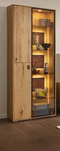 02 Global Wohnen Fibra Highboard, Front: Asteiche massiv geölt, Korpus außen: Asteiche Furnier geölt, Korpus innen: Melamin Wildeiche Nachbildung, sichtbare Hirnholzblöcke Asteiche massiv, Glastür und Glasböden Parsolglas braun, Metallgriffe anthrazit, BHT ca. 158x122x37cm, ohne Beleuchtung 1498.-*, Global Wohnen Fibra Highboard als Variante wie beschrieben und abgebildet mit LED-Beleuchtung 1704.-*