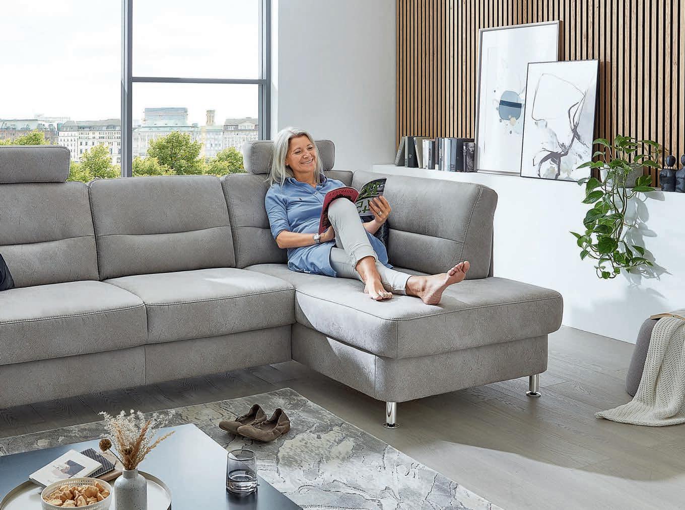In dieser praktischen RelaxEcke können Sie den Alltag hinter sich lassen. Der Winkel lässt sich in beideRichtungen verstellen und das Kopfteil kann der Neigung angepasst werden. Für langes Sitzen ohne Verspannung. Mehrpreis 398,- zuzügl. Kopfteilverstellung.