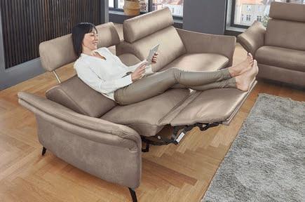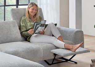 Man sieht es der Couch und der Funktion nicht an, die Technik ist nämlich unter dem Sitzversteckt.Mit einem Motor lässt sich die Fußstütze bis zur Sitzkante hochfahren und bietet so eine bequeme Beinauflage. Mehrpreis 498,-