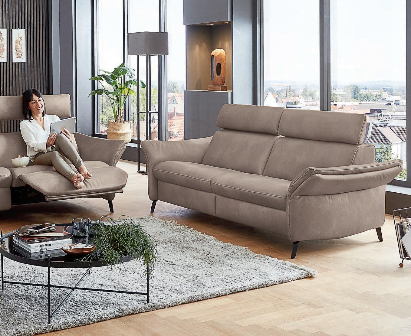Das ist der Trend! Die breite Recamiere zum Lümmeln in Verbindung mit einem Sofa zum Sitzen, das aber mit einer bequemen Relaxfunktion ausgestattet werden kann. Für jeden Mitbewohner der passende Platz! 306 cm, Armlehnen Das breite Longchair bietet auch mal Platz für zwei Personen, hier ist Zweisamkeit angesagt. Und per Knopfdruck fährt der Sitz elektrisch nach vorne, der Rücken senkt sich ab und Sie erhalten eine fast waagerechte Liegefläche von knapp 220 cm –Das ist Relaxen Pur! Mehrpreis 1.198,!