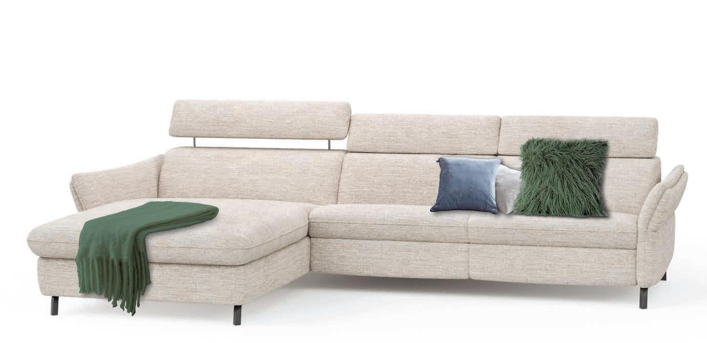 kleine Winkelkombination in einem hochwertigem Stoffbezug, ca. 199 x 306 cm, Füße Metall schwarz, inklusive klappbaren Armlehnen und verstellbarer Kopfstütze in der Recamiere, ohne weitere Funktionen, Kissen und Deko.