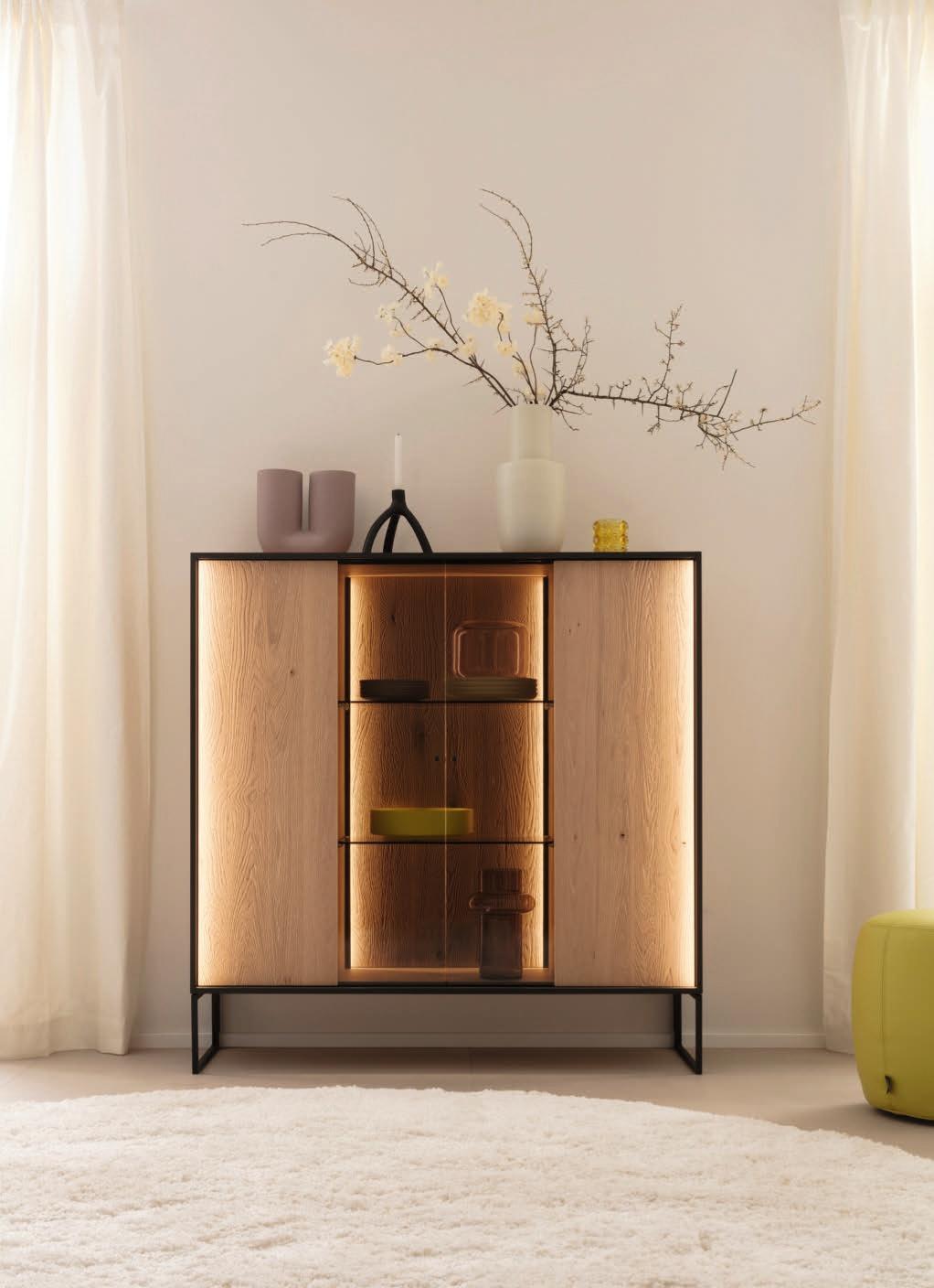 Was ist die Designidee hinter dem Möbelprogramm »Yola«? Neben der architektonischen Form, die durch den dunklen Metallrahmen zum tragenden Element wird, haben wir uns auf das Material Massivholz konzentriert. Große, beleuchtete Flächen lenken den Blick auf Unikate, verstärken die naturgewachsene, grobporige Struktur. Wir wollten ein Möbel mit einer klaren Aussage entwickeln, das Strahlkraft besitzt und Handwerklichkeit zeigt.