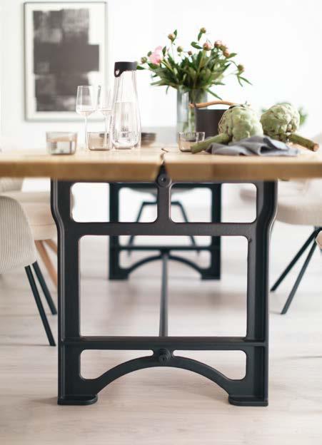 Massive Werkbänke, kühles Metall, schlichtes Holz – die Industrie-Ästhetik der Vergangenheit erobert unsere Herzen, weil sie Geschichten von schlichter Schönheit und gutem Handwerk erzählt. Das Vorbild des gusseisernen Untergestells von Esstisch TALE* stand in einer alten Fabrik. Jetzt trägt es eine massive Holzplatte, die zwar glattgehobelt ist, aber mit ihrer Baumkantenoptik rauen Charme versprüht. Ein Duo, das langweilige Wohnwelten mit Leichtigkeit aufmöbelt.