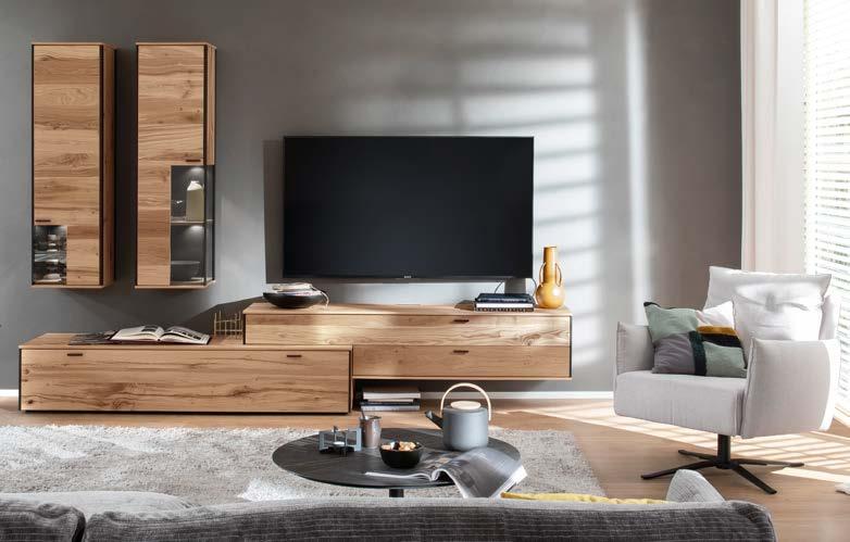Das Ergebnis: offene Übergänge, mehr Bewegungsund Blickfreiheit und flexibleres Wohnen. Was bedeutet das für die Möbel und die Einrichtung? Klar, das Sofa und der Couchtisch bilden eine Einheit in der Wohnecke und wo der Esstisch steht, trifft man sich mit Freunden und Familie zum kulinarischen Genießen. Aber das Sideboard im Wohnzimmer kann auch im Esszimmer stehen. Und die Vitrine macht sich neben dem Lowboard mit Fernseher genauso gut, wie hinter den Stühlen am Tisch. Bei Stauraummöbeln trennt man nicht mehr nach Funktionsbereichen. Der Vorteil: Sie müssen nicht mehr ein Leben lang an einem Platz stehen, sondern wandern dorthin, wo man sie braucht. Der Nachteil: Der muntere Mix und die neuen Sichtachsen brauchen optische Ruhe. Die Lösung: Flexible Möbelprogramme, die Geschirr genauso gut unterbringen wie den Fernseher, die aber gestalterisch auf einer Linie liegen und in allen Wohnbereichen sowie mit dem Esstisch und den Stühlen gemeinsame Sache machen. Gibt’s nicht? Blättern Sie mal weiter!