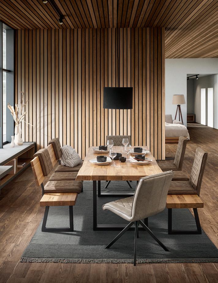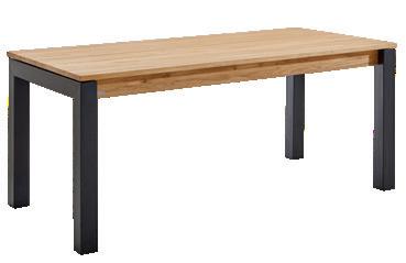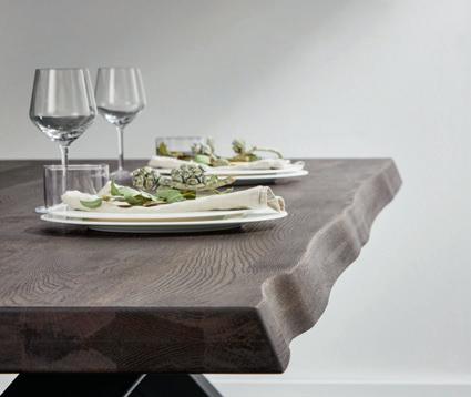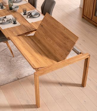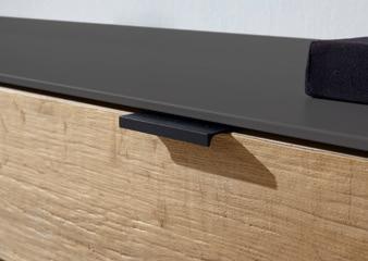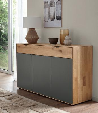 03 NATURA HOME Stamford Hockerbank, Bezug: Stoff 0810-02 blau (100 % Polyester), Sitzqualität: Vollschaumsitz, Holzfuß Eiche geölt, BHT ca. 89×46×65 cm, 569,– 04 NATURA HOME Tucson Highboard, Korpus Wildeiche massiv, Front Lack anthrazit, Rückwand mit Spalteiche-Akzent, Griffe: Metall carbonfarbig, inkl. Beleuchtung, BHT ca. 139x139x38 cm, 3.999,–
