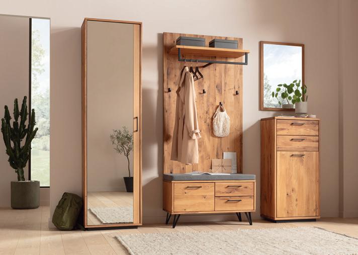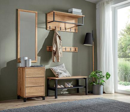 02 NATURA HOME Savannah Gardobenschrank, Korpus: Wildeiche massiv, natur geölt, Front: Spiegel, Metallgriff schwarz, BHT ca. 55x205x38 cm, 1.299,– 03 NATURA HOME Savannah Garderobenbank, Korpus und Front: Wildeiche massiv, natur geölt, Metallfuß & -griff schwarz, Sitzauflage grau (100 % Polyester), BHT ca. 90x56x42 cm, 979,– 04 NATURA HOME Savannah Garderobenpaneel, Korpus und Front: Wildeiche massiv, natur geölt, Haken und Kleiderstangen: Metall schwarz, BHT ca. 90x157x36 cm, 829,– 05 NATURA HOME Savannah Kommode, Korpus und Front: Wildeiche massiv, natur geölt, Metallgriff schwarz, BHT ca. 55x115x38 cm, 899,– 06 NATURA HOME Savannah Wandspiegel, Rahmen: Wildeiche massiv, natur geölt, BHT ca. 55x80x2 cm, 219,–