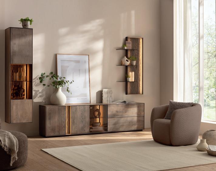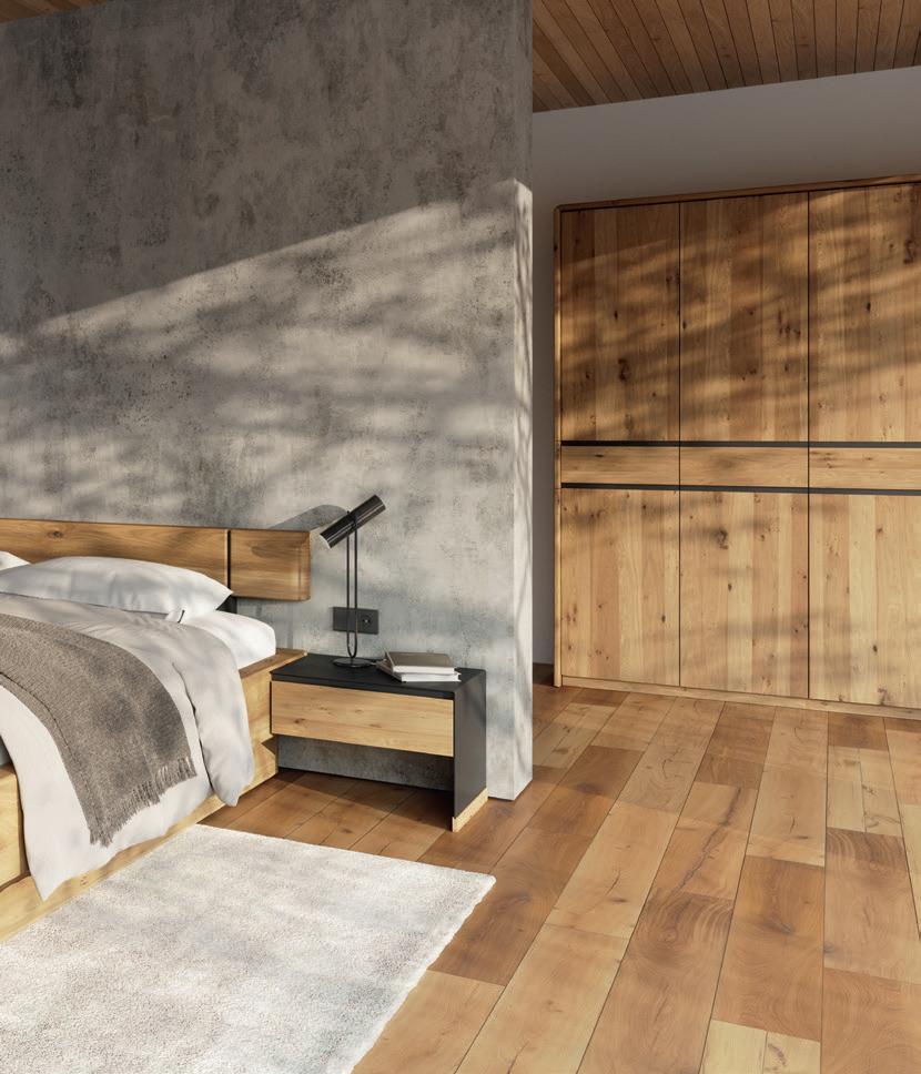 01 NATURA HOME Scottsdale Kleiderschrank, Korpus und Front: Wildeiche massiv, natur lackiert, Bauchbinde mit Lamellenakzent, Passepartout in Wildeiche mit Beleuchtung, BHT ca. 257x227x66 cm, 6.499,– 02 NATURA HOME Scottsdale Bettanlage, Bettrahmen: Wildeiche massiv, natur lackiert, Kopfteil mit Lamellenakzent, Nachtkonsole mit anthrazit lackierter Front, Paneelaufsatz mit Beleuchtung, Polsterkopfteil anthrazit, Liegefläche ca. 180x200, BHT ca. 318x100x218 cm, 4.999,– 03 NATURA HOME Scottsdale Sideboard, Korpus Wildeiche massiv, natur lackiert, Front Lack anthrazit, Schubkastenfront: Lamellenoptik, Griffe: Metall carbonfarbig, BHT ca. 152x88x46 cm, 2.449,–Alle UVPs und Infos zu NATURA HOME Scottsdale