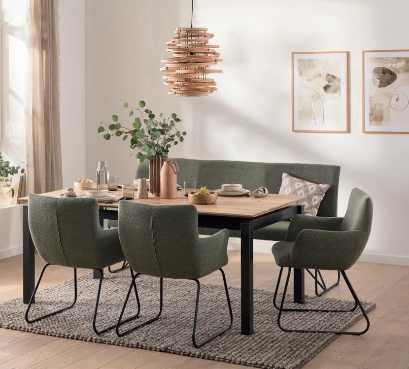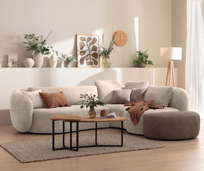 01 NATURA HOME Karasu Ecksofa, Bezug: Bouclé Catch Me 02 natur (100 % Polyester), Sitzqualität: Kaltschaum, 297x90x225 cm, 2.999,– 02 NATURA HOME Karasu Anstellhocker, Bezug: Bouclé Catch Me 04 taupe (100 % Polyester), Sitzqualität: Kaltschaum, 90x42x65 cm, 429,– 03 NATURA HOME Karasu Couchtisch, Größe small, Eiche natur gewachst, Gestell: Metall schwarz, pulverbeschichtet, BHT ca. 45x43x48 cm, 189,– 04 NATURA HOME Karasu Couchtisch, Größe large, Eiche natur gewachst, Gestell: Metall schwarz, pulverbeschichtet, BHT ca. 96x39x90 cm, 339,–05 NATURA HOME Karasu Sessel, Bezug: Bouclé Catch Me 04 taupe (100 % Polyester), Sitzqualität: Kaltschaum, BHT ca. 85x90x80 cm, 649,– 06 NATURA HOME Karasu Sessel, Retro Bliss 02 creme (100 % Polyester), Füße und Armlehne in Eiche, massiv lackiert, BHT ca. 90x87x93 cm, 659,–