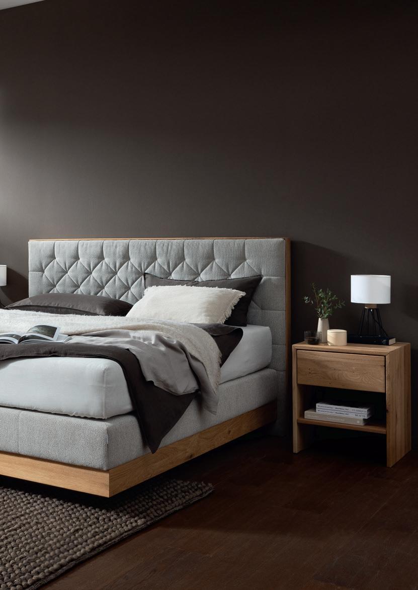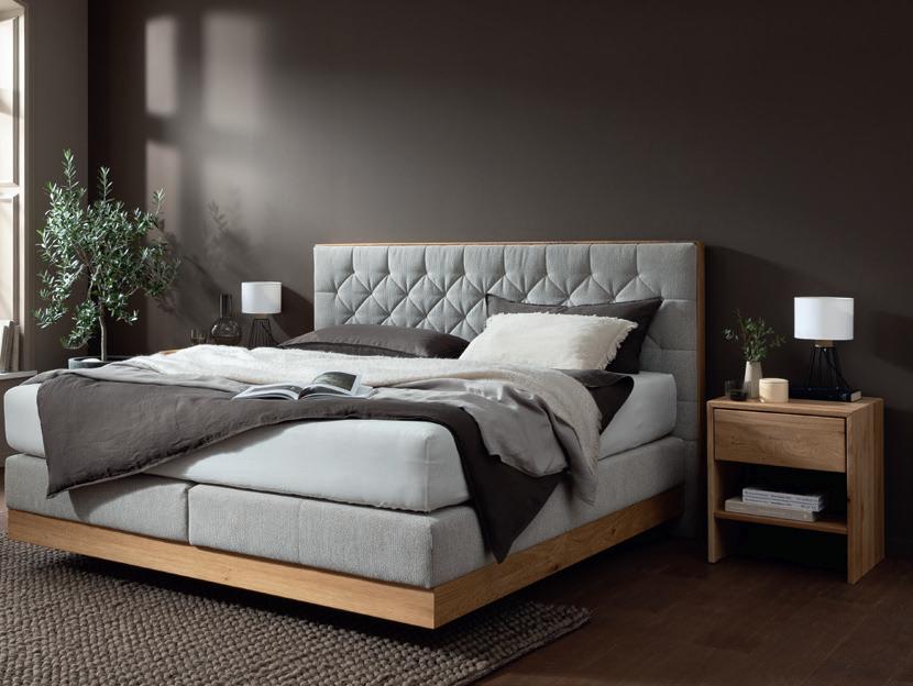 01 NATURA HOME Alpin Luxe Boxspringbett, Bezug: Stoff graubeige, Box LX50, Kopfteil LX04, Bettseiten und Sockelleiste aus Wildeiche, natur geölt, 2x Matratzen Natura Alpin Luxe TF1000 mit Latexauflage, Liegefläche ca. 180x200 cm, BHT ca. 213x120x190 cm, 5.799,–, ohne Deko 02 NATURA HOME Alpin Luxe Nachttisch, Wildeiche, natur geölt, inkl. Schubladen und Ablageboden, BHT ca. 50x47x60 cm, 1.299,–