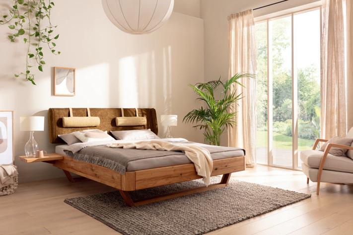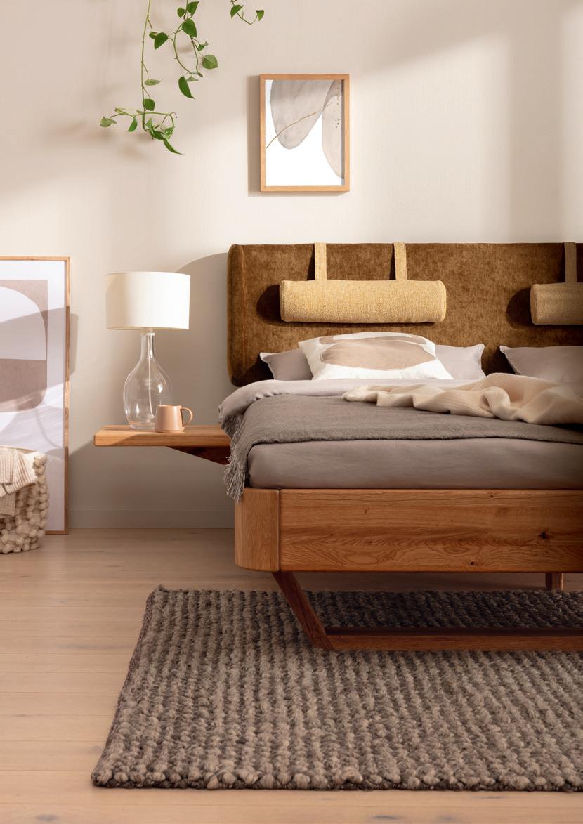 01 NATURA HOME 1660 Massivholzbett mit Polsterkopfteil, Wildeiche, natur geölt, Polsterkopfteil in Eros Forest (51 % Acrylic, 40 % Polyester, 9 % Viskose) mit zwei hängenden Nackenpolster in Nolio 66 ocker (90 % Polyester, 10 % Polyacrylnitril), Kufengestell, Liegefläche ca. 180x200 cm, BHT ca. 189x104x218 cm, 2.499,– 02 NATURA HOME 1660 Nachttisch, Wildeiche, natur geölt, BHT ca. 47x4x39 cm, 189,–, ohne Deko