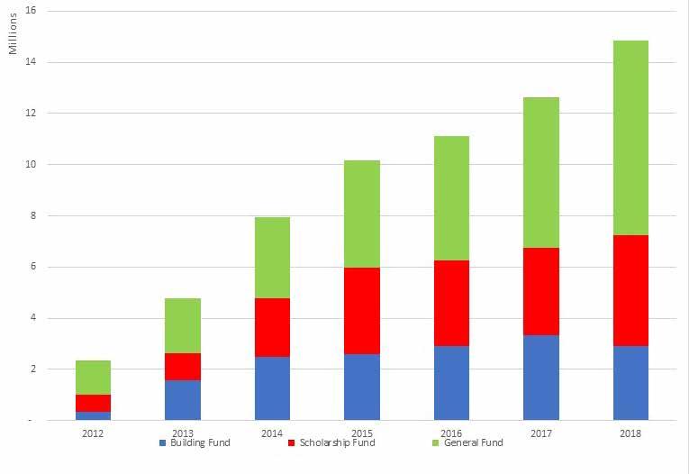 The bar chart illustrates the growth of the individual funds within the Foundation from inception in 2012 and, due significantly to the bequest and endowment funds received during the 2018 year, the net asset position now stands at $14.8 million, which represents growth of 19.7 per cent over 2017.
