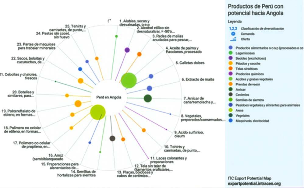 De acuerdo con el International Trade Center (ITC), los productos con mayor potencial de exportación del Perú a Angola hacia el 2029 son las alubias, secas y desvainadas; alcohol etílico sin desnaturalizar, >=80% alcohol; y, redes de mallas anudadas para pescar, de textil artificial. Las lacas colorantes y preparaciones es el producto exportado por Perú con la mayor capacidad de oferta. Los aceites de palma y fracciones, procesado es el producto que enfrenta el mayor potencial de demanda en Angola. En: donde también se puede ver el desagregado por cada partida.