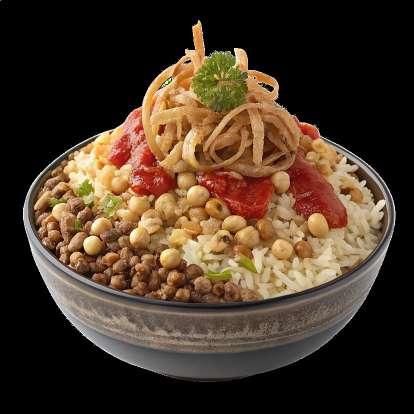 Koshari is an Egyptian national dish that combines carbohydrates with a spicy tomato sauce and crispy fried onions. It is a comforting, flavorful and very popular dish.