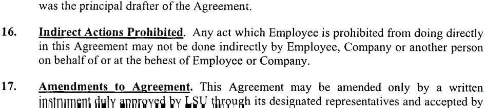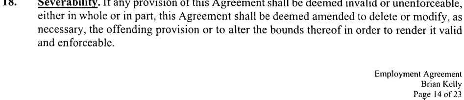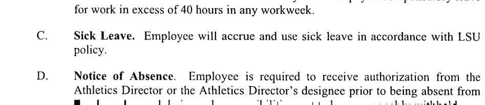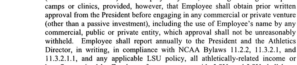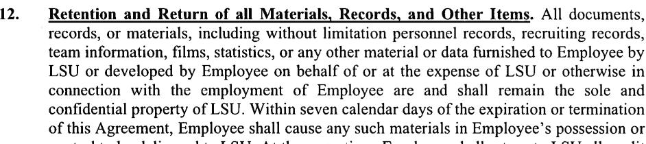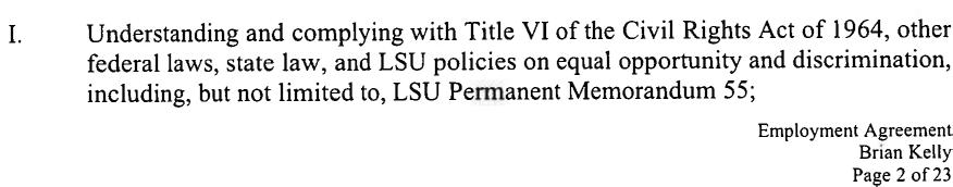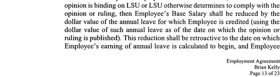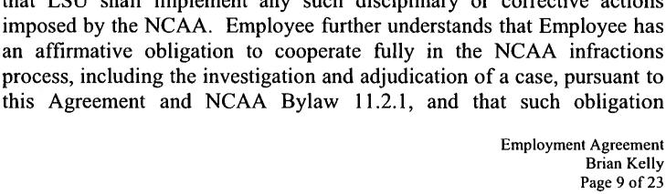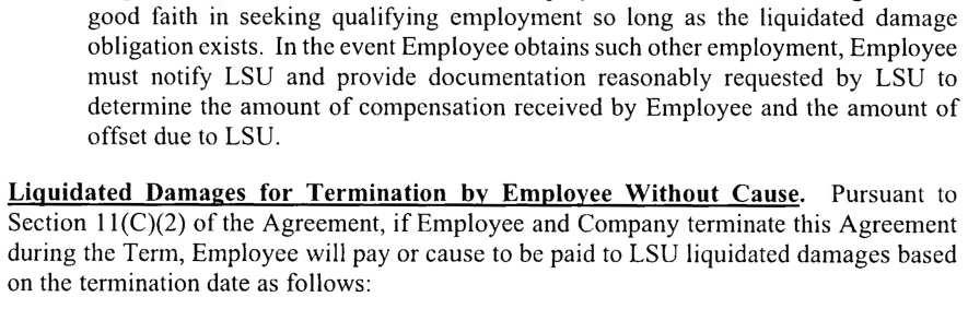 payments and/or eliminating the mitigation and offset provisions of theAgreement. Coach Kelly informed LSU that absent any such agreement, he intends to enforce the current terms of Section 11.B.1 and Schedule Aof theAgreement.