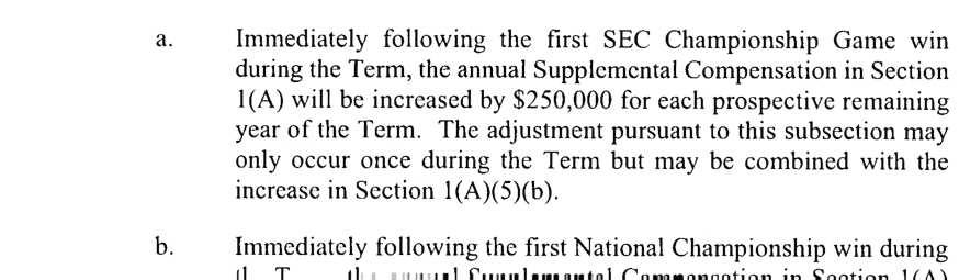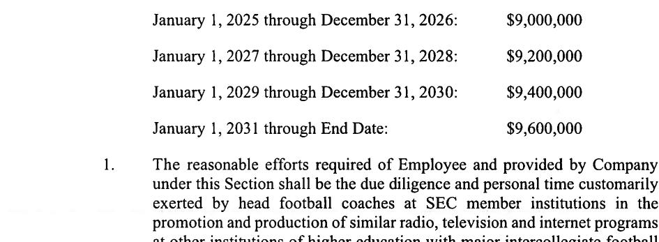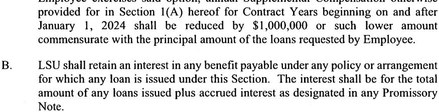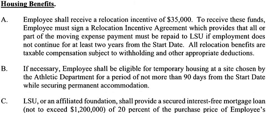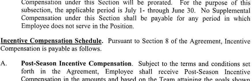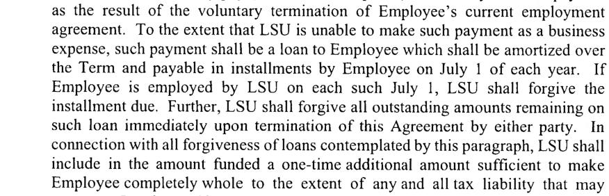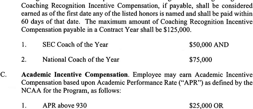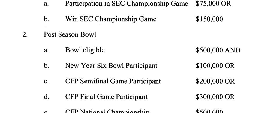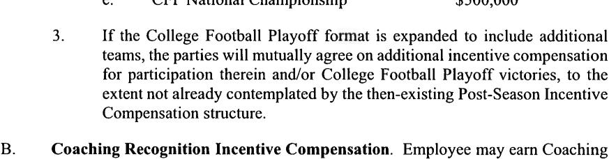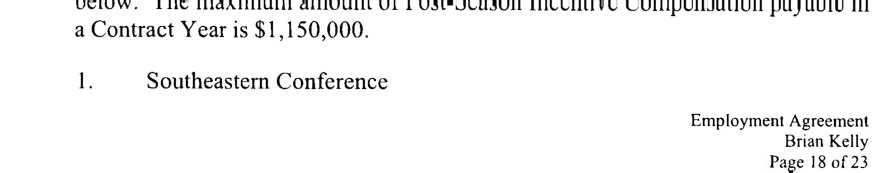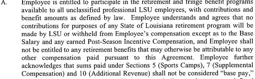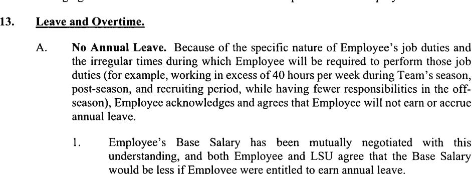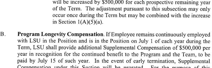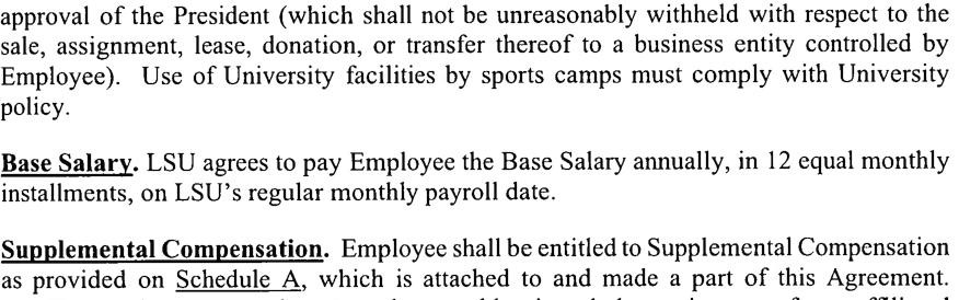 20. In addition to the Base Salary and Supplemental Compensation, theAgreement provides for payments of an additional $500,000 per year during the Term if Coach Kelly remained continuously employed (“Longevity Compensation”). (Schedule A§ 1.B.) It also requires LSU to make incentive-based payments and to provide other benefits to Coach Kelly while he serves as Head Coach. (Agreement §§ 8, 9.)