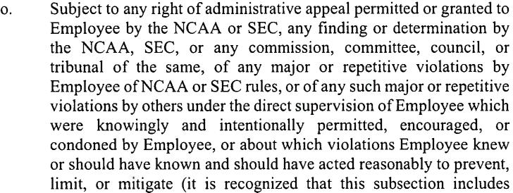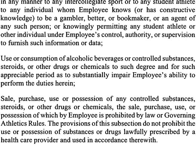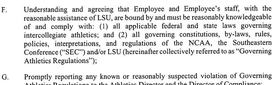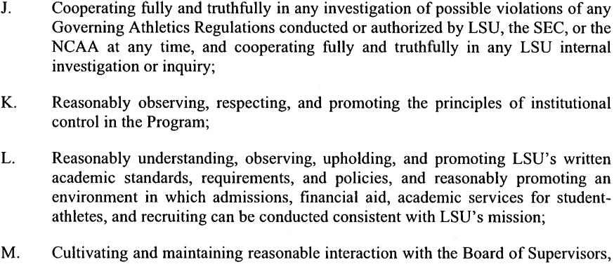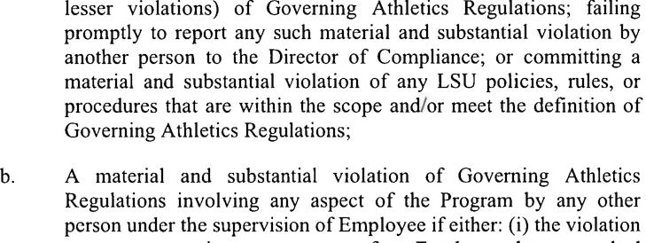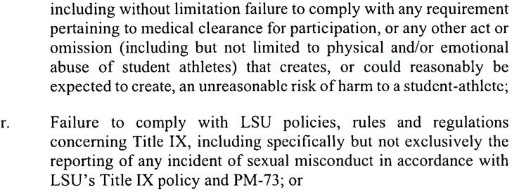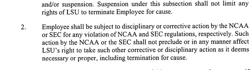 26. Section 11.A.1 of theAgreement defines “cause” to include conduct like violating certain LSU rules, pleading guilty to a felony, committing fraud or engaging in other “serious misconduct.” (Agreement § 11.A.1.)