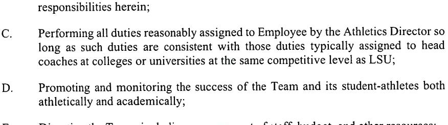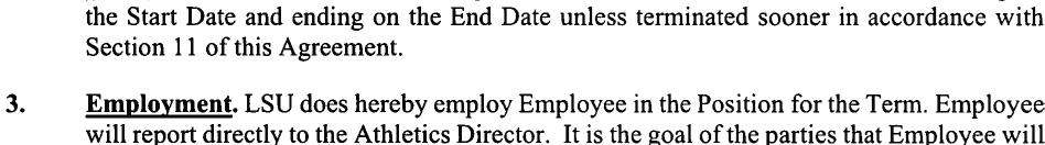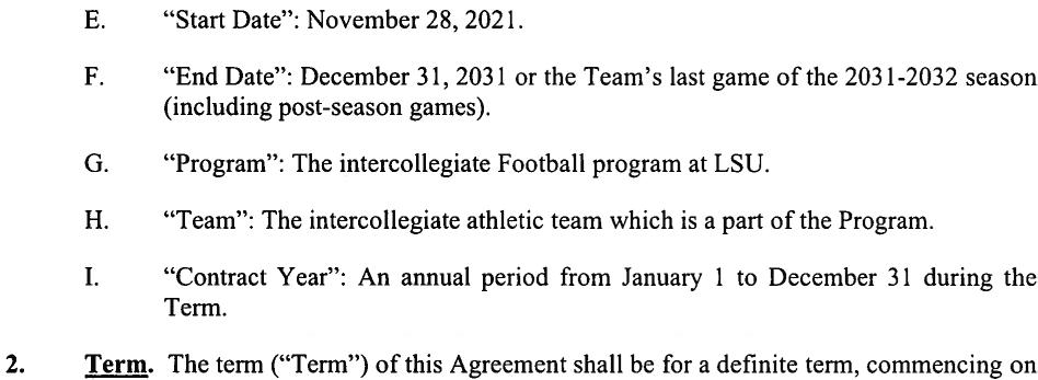 18. Coach Kelly and LSU executed a term sheet in November 2021 and the Agreement inApril 2022. TheAgreement provides that Coach Kelly would serve as the Head Coach of the Team for a ten-year term (the “Term”), from November 28, 2021, to December 31, 2031, or following the Team’s last game of the 2031–2032 season. (Agreement §§ 1, 2.)